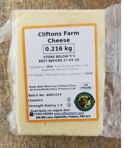 | Cliftons Farm cheese – Cheshire | various weights | £16.00/kg | £20.00/kg | £20.00/kg | ![]() |